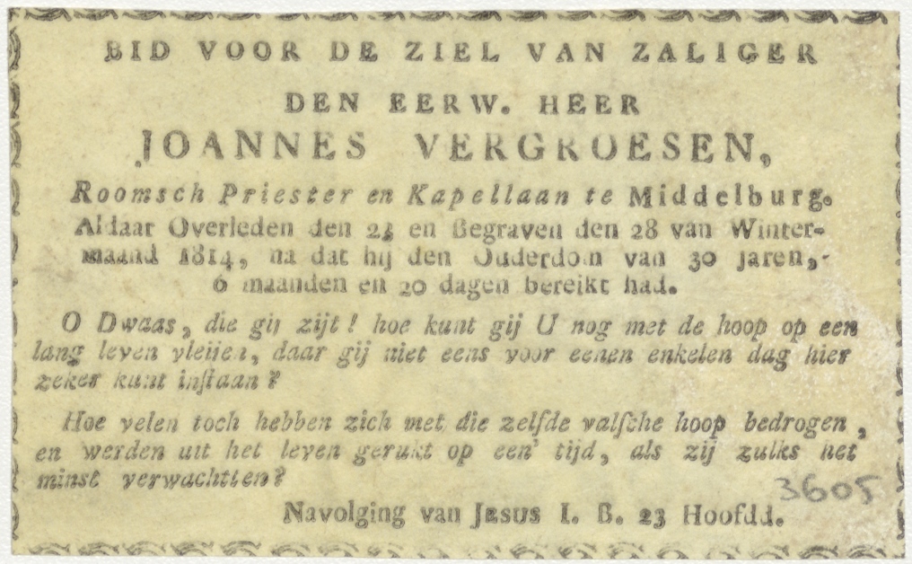 H. Familie, kz. Religieus; bid voor ziel Johannes Vergroegen (+1814) pastoor en kapellaan te Middelburg