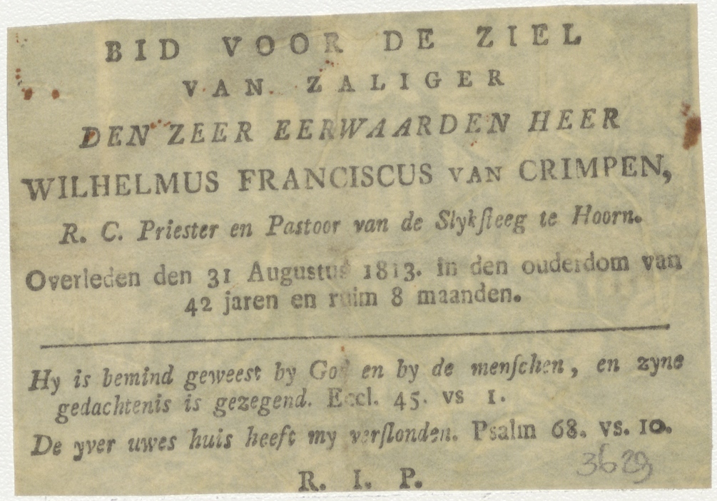 De rijkaard en de arme wrek, kz. Religieus; bid voor ziel Wilhelmus van Crimpen (+1813) pastoor de Slyksteeg te Hoorneest
