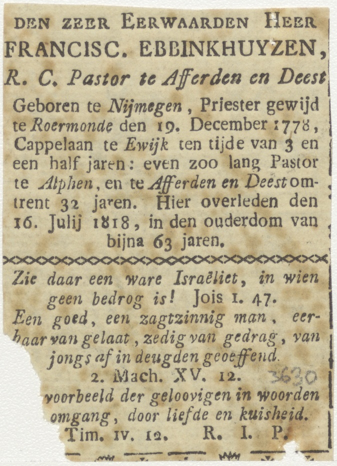 H. man bij graf, kz. Religieus; bid voor ziel Franciscus Ebbikhuyzen (+1818) pastoor te Afferden en Deest