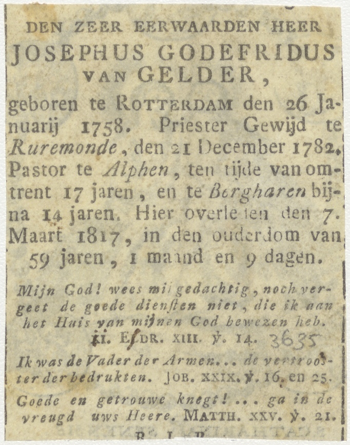 H. Catharina van Siena, kz. Religieus; bid voor ziel Josephus van Gelder (+1817) pastoor te Alphen