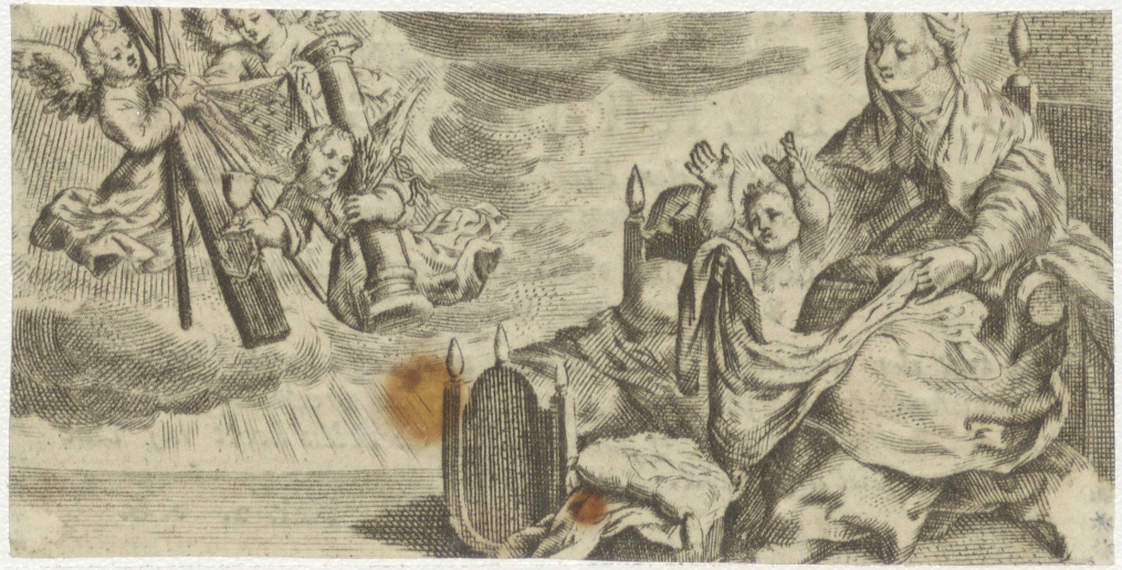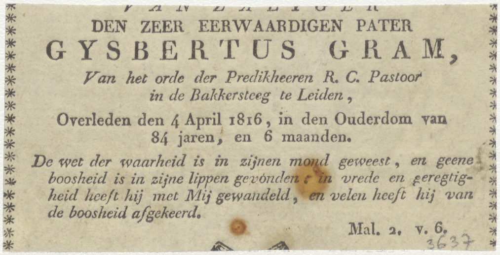 Maria met Christuskind en martelwerktuigen, kz. Religieus; bid voor ziel Gijsbertus Gram (+1816) predikheer, Bakkersteeg Leiden