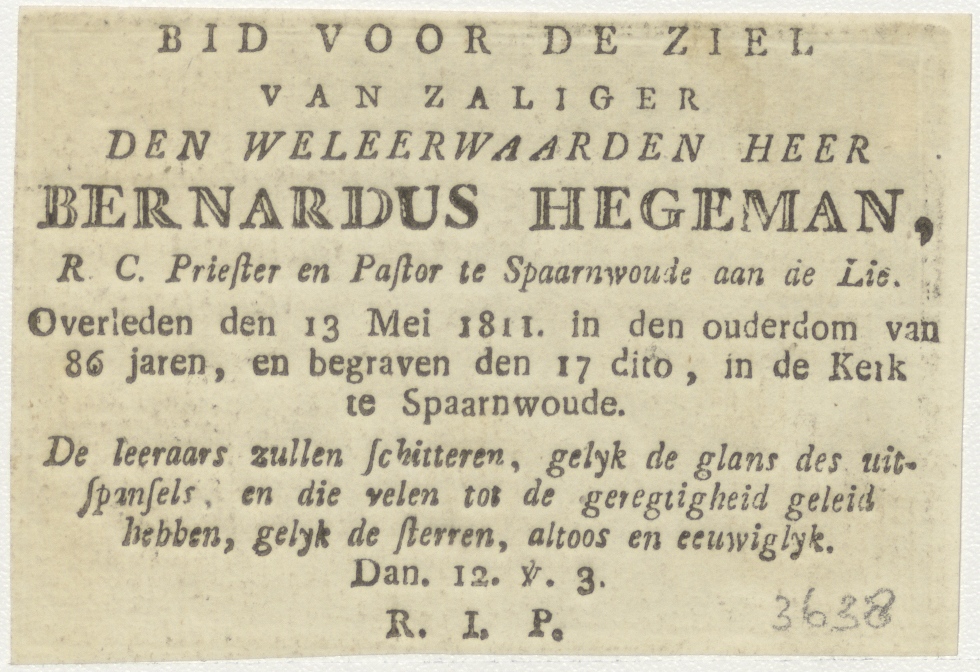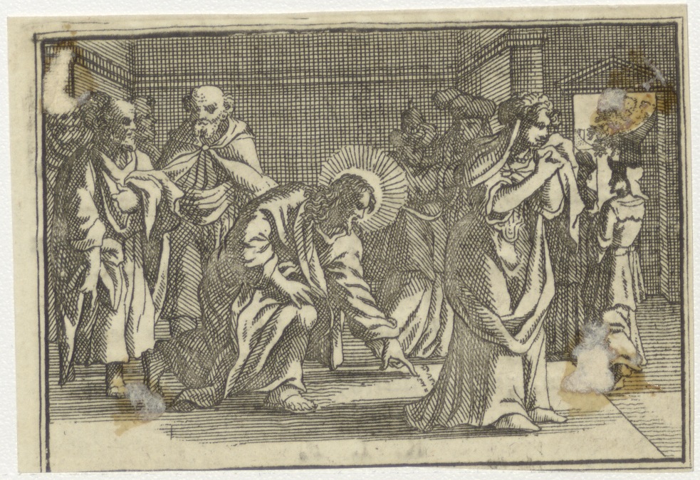 Christus schrijft in het zand: hij die zonder zonden is..., kz. Religieus; bid voor ziel Bernardus Hegeman (+1811) pastoor te Spaarnwoude aan de Lie