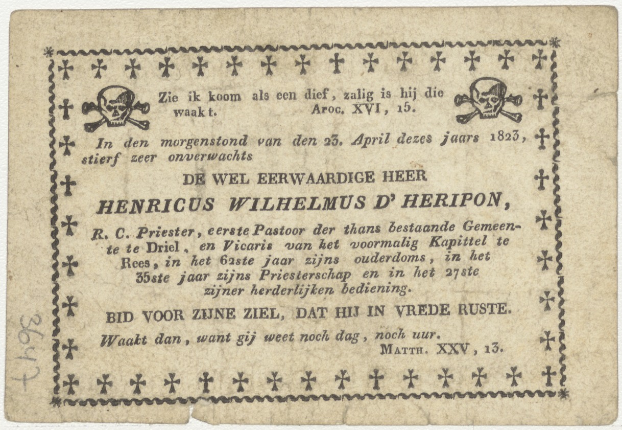 H. Elisabeth, kz. Religieus; bid voor ziel Henricus d'Heripon (+1824) pastoor te Driel, vicaris kapittel te Rees