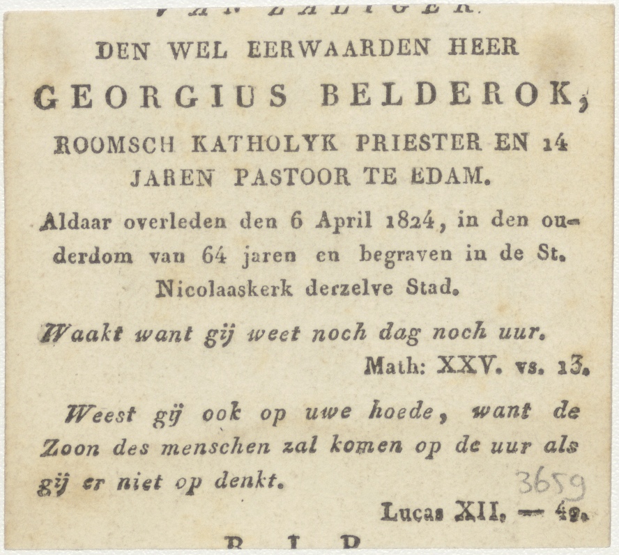Aanbidding der koningen, kz. Religieus; bid voor ziel Georgius Belderde (+1824) pastoor te Edam