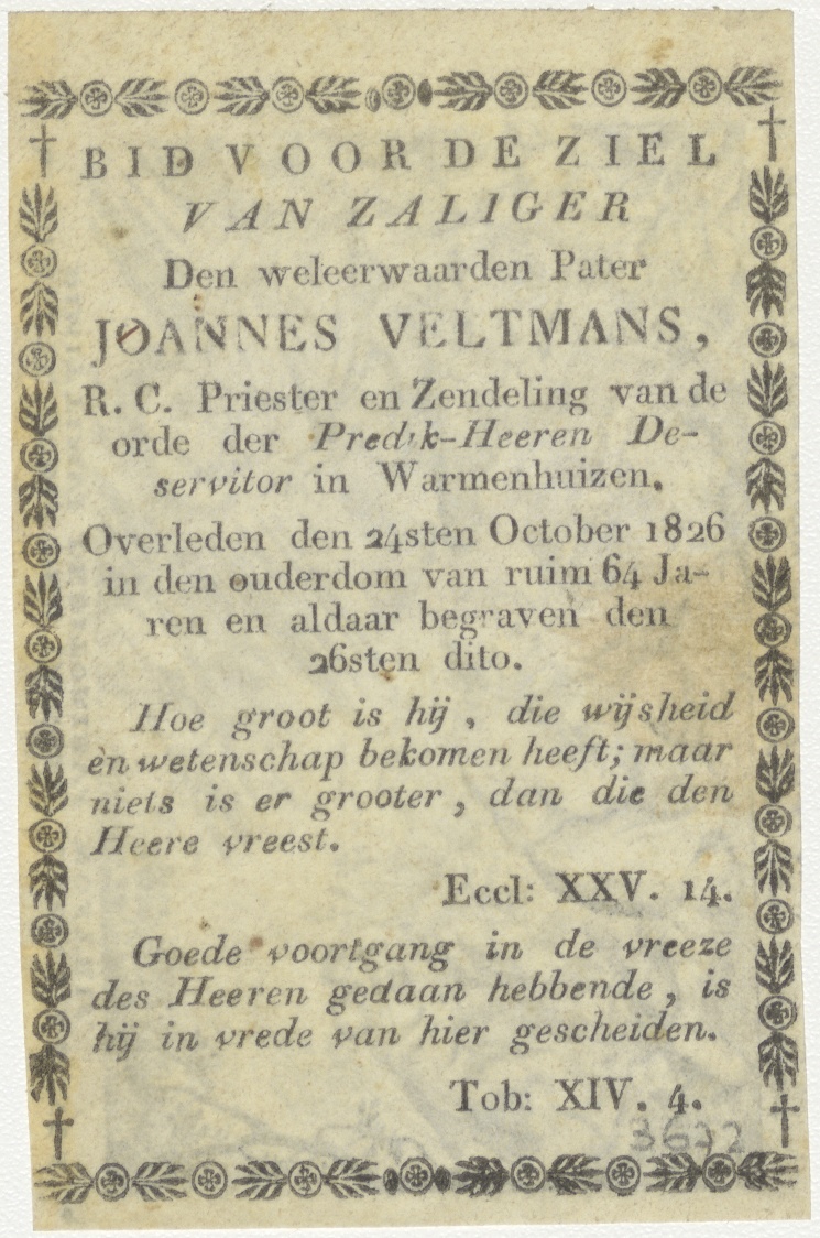 En vergeef ons onze schuld gelijk ook wij vergeven onze schuldenaren, kz. Religieus; bid voor ziel Joannes Veltmans (+1826) predikheer in Warmenhuizen