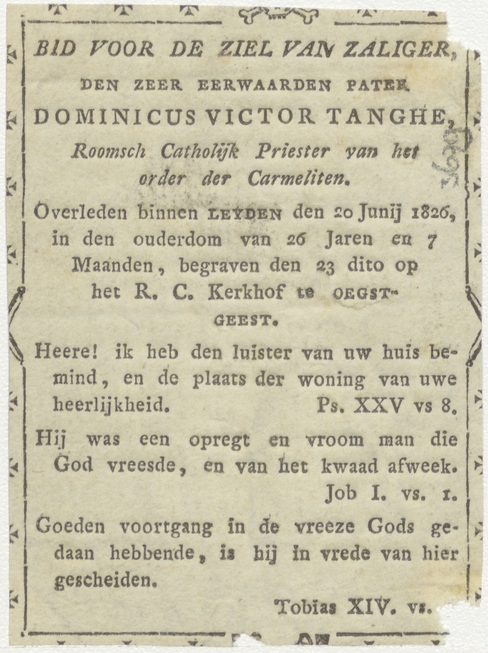 Maria met Christuskind, kz. Religieus; bid voor ziel Dominicus Tange (+1826) carmeliet Leiden