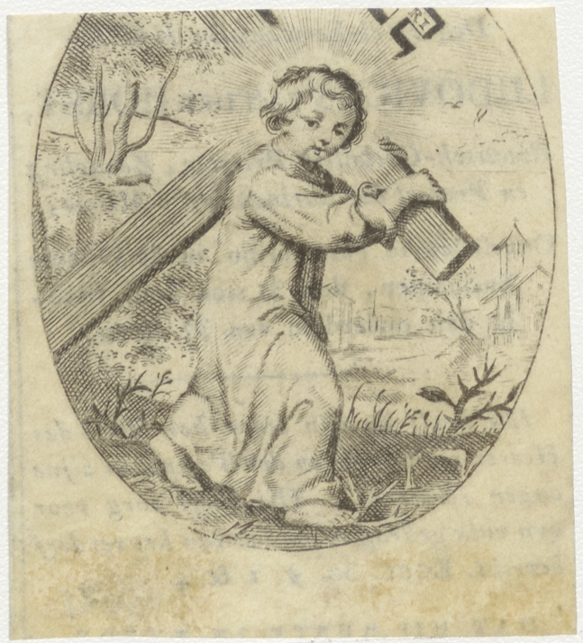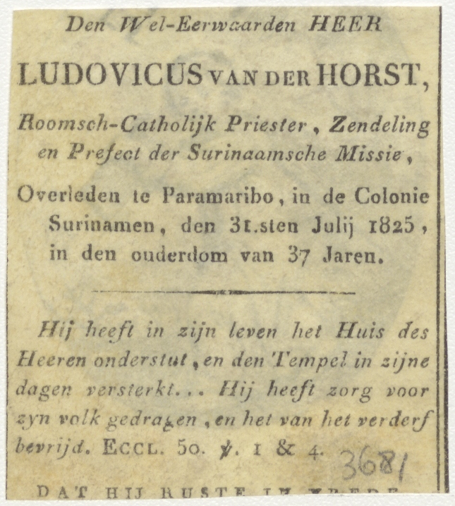 Christuskind met kruis, kz. Religieus; bid voor ziel Ludovicus van der Horst (+1825) pastoor zendeling in de missie Paramaribo