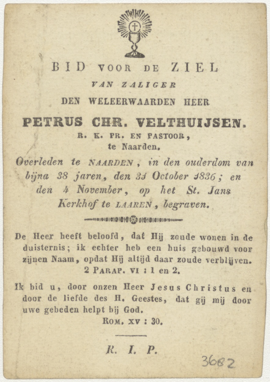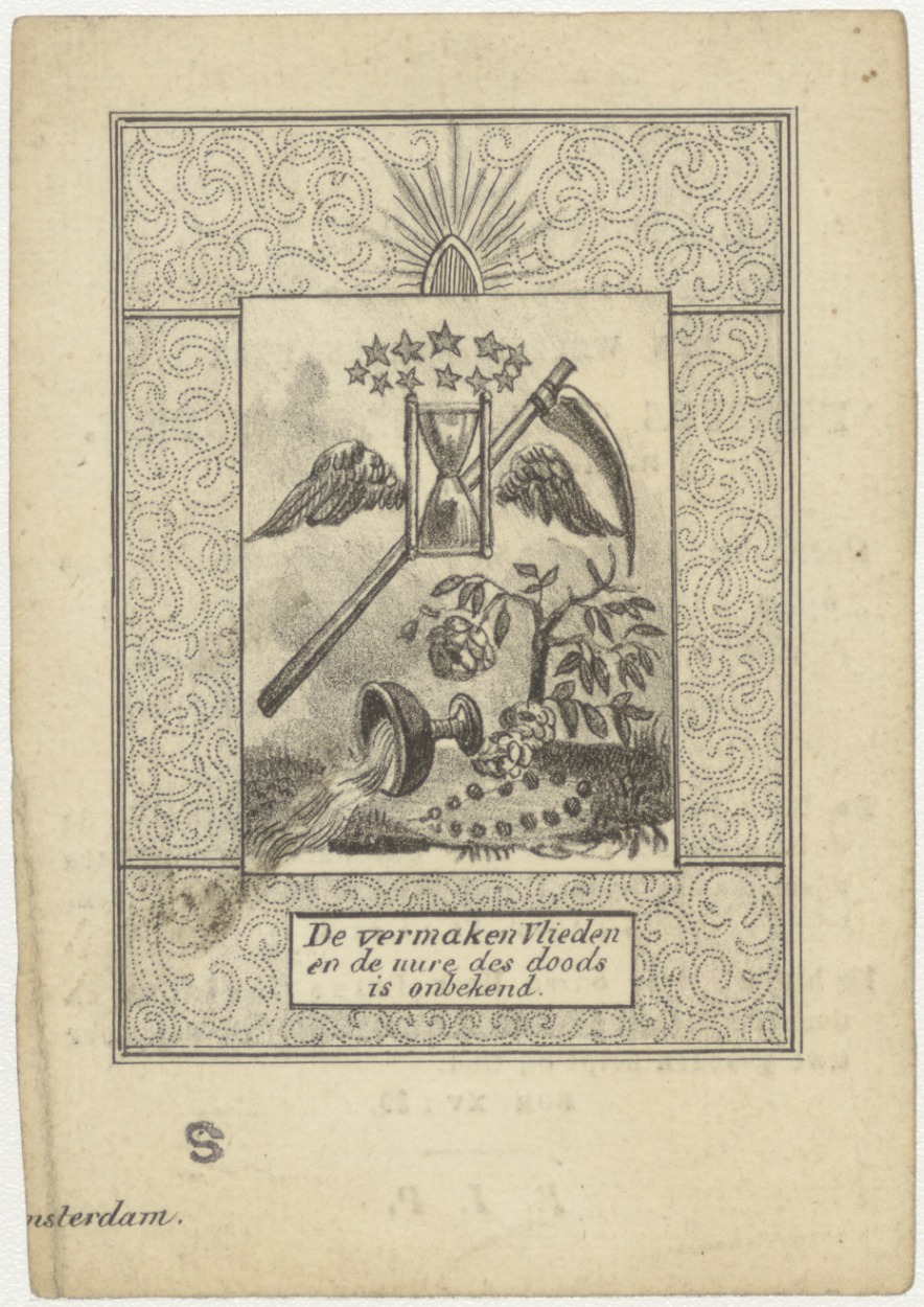 Vermaken vlieden... Vanitasscène, kz. Religieus; bid voor ziel Petrus Velthuysen (+1836) pastoor te Naarden