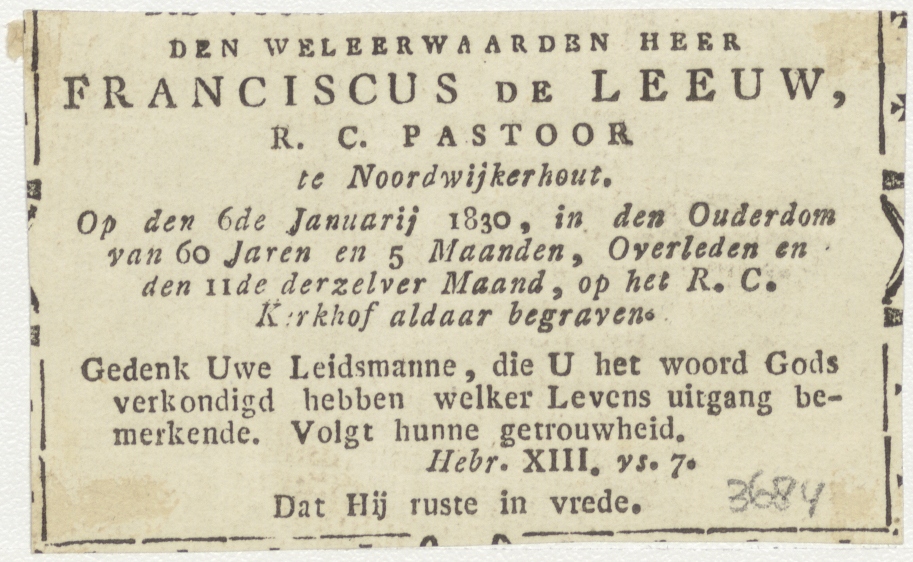 Onze Vader die in de hemelen zijt..., kz. Religieus; bid voor ziel Franciscus de Leeuw (+1830) pastoor te Noordwijkerhout