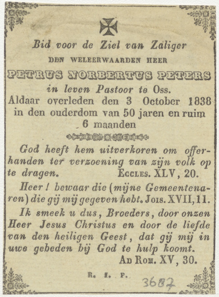 H. Maria, kz. Religieus; bid voor ziel Petrus Peters (+1838) pastoor te Oss
