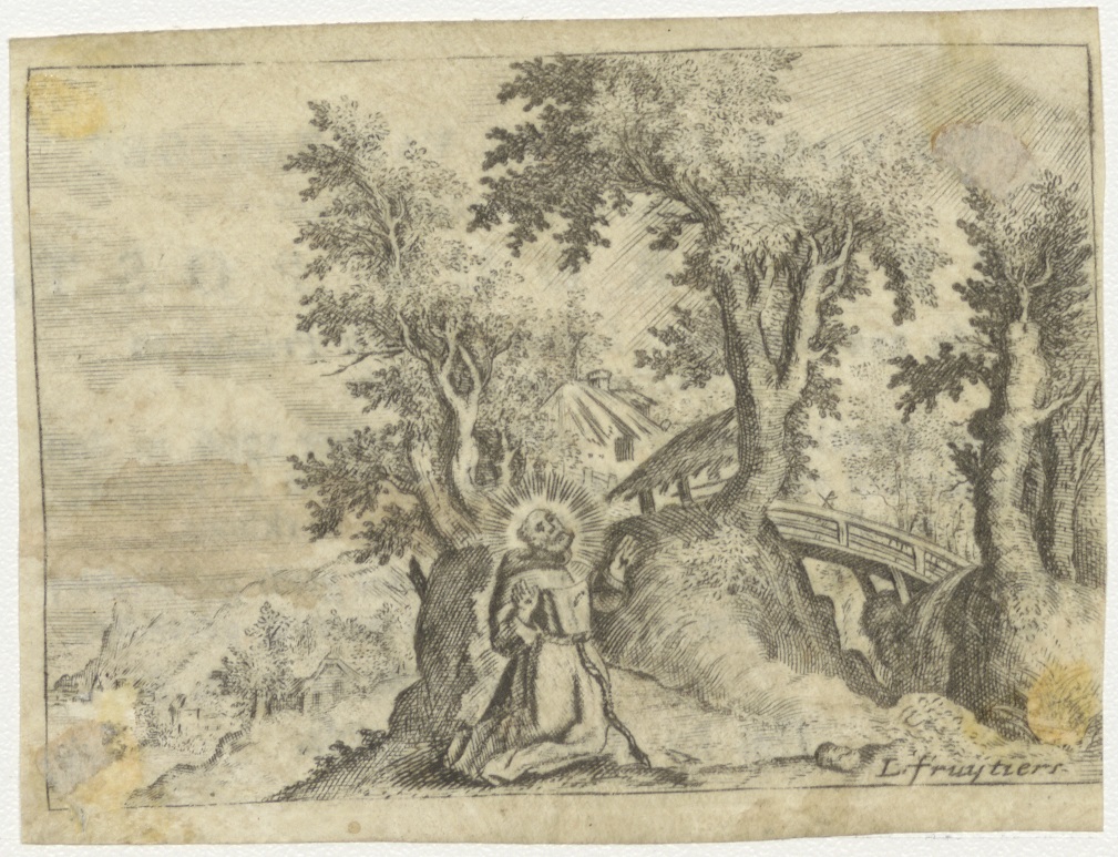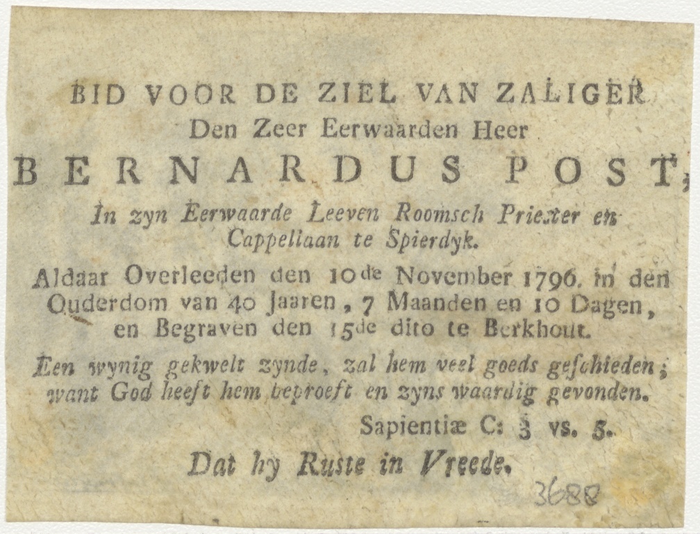 Biddende kluizenaar, kz. Religieus; bid voor ziel Bernardus Post (+1796) pastoor te Spierdijk