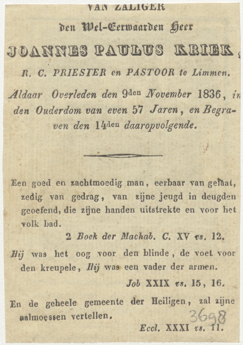 Stervelingen..., kz. Religieus; bid voor ziel Joannes Kriek (+1836) pastoor te Limmen