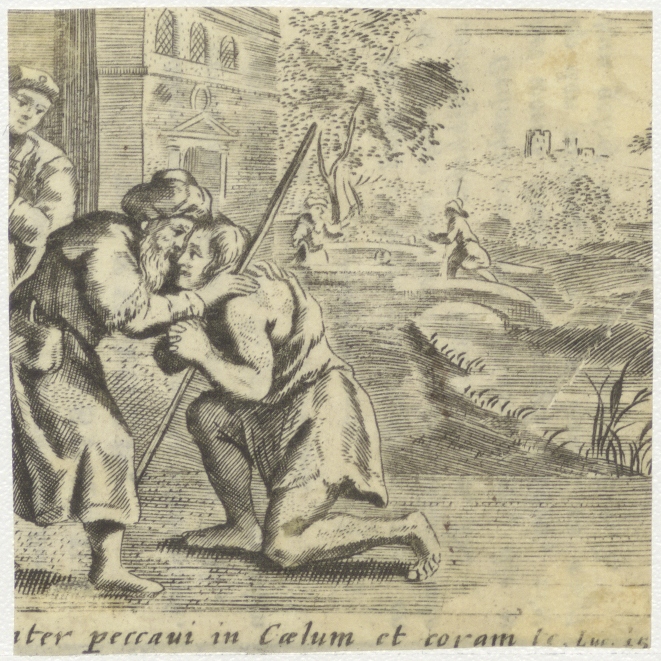 Terugkeer van de verloren zoon, kz. Religieus; bid voor ziel Johannes de Zwager (+1841) landdeken Zeeland, pastoor 's-Heerenhoek