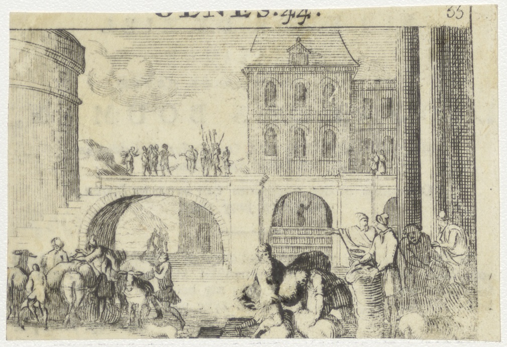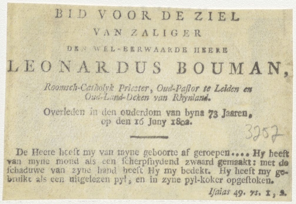 Zakken worden door Jozef met koren gevuld, kz. Religieus; bid voor ziel Leonardus Bouman (+1802) pastoor te Leiden