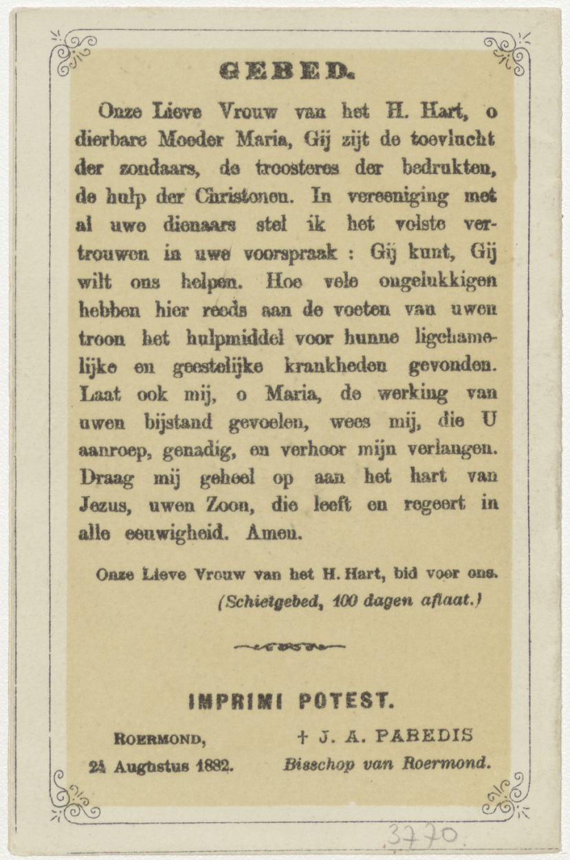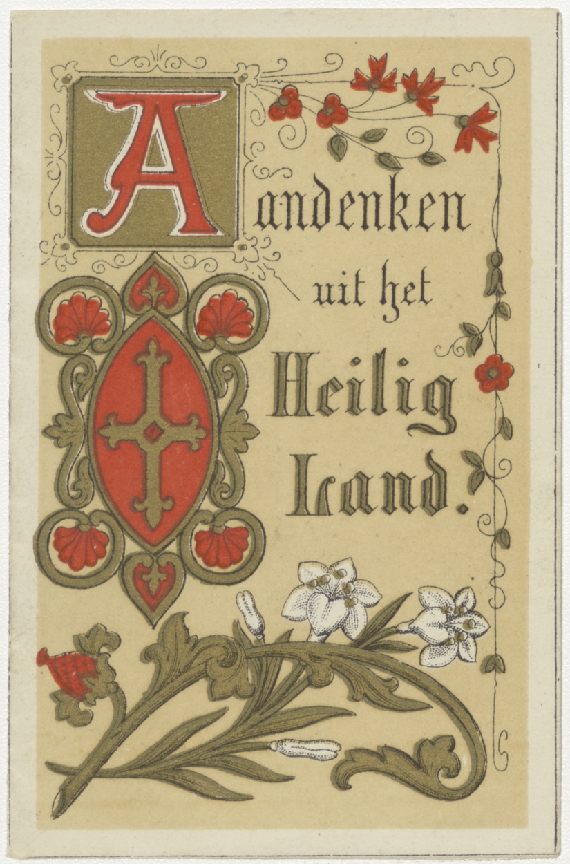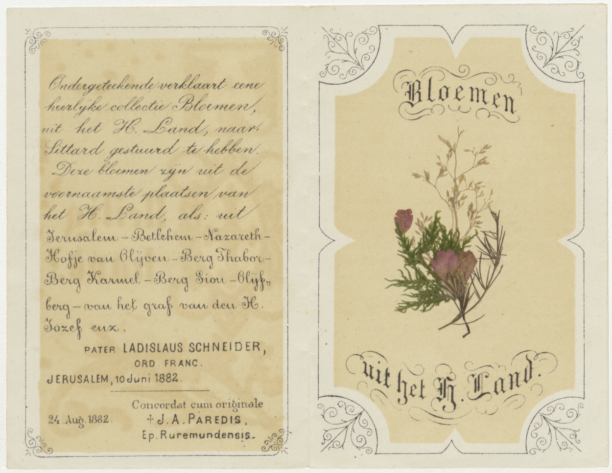 Reliekprent waarin droogbloemen, met "Aandenken uit het heilig land", en met "Ondergeteekende verklaart eene heerlijke collectie bloemen ... naar Sittard ... Ladislaus Schneider ... 1882 ..."