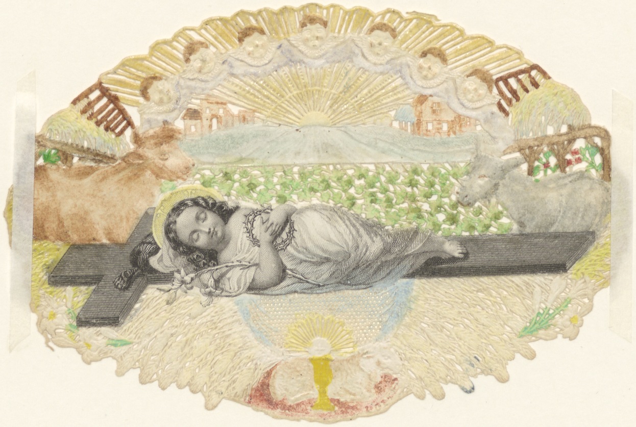 Christuskind op kruis, ingekleurd, kz. gebed (Frans)