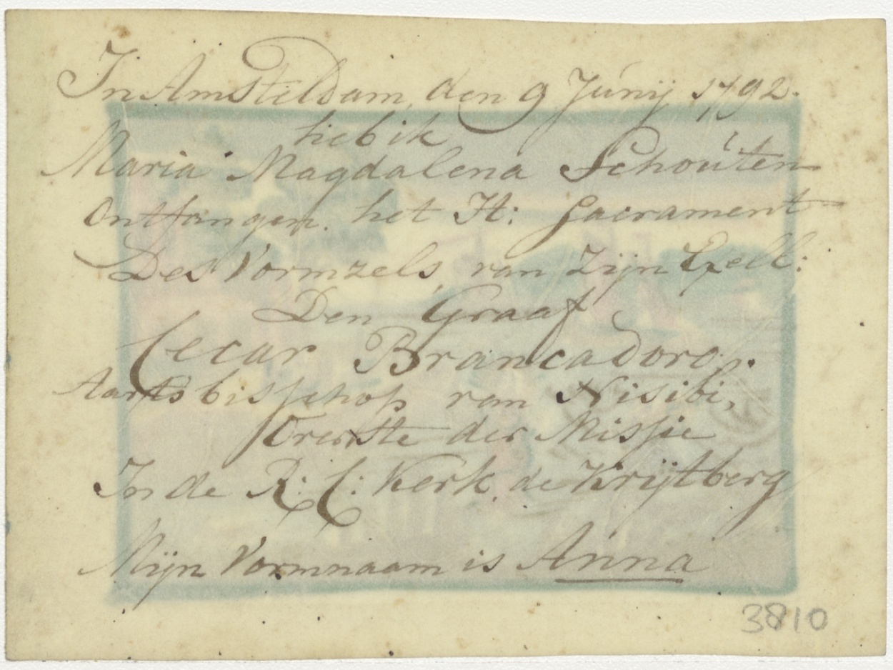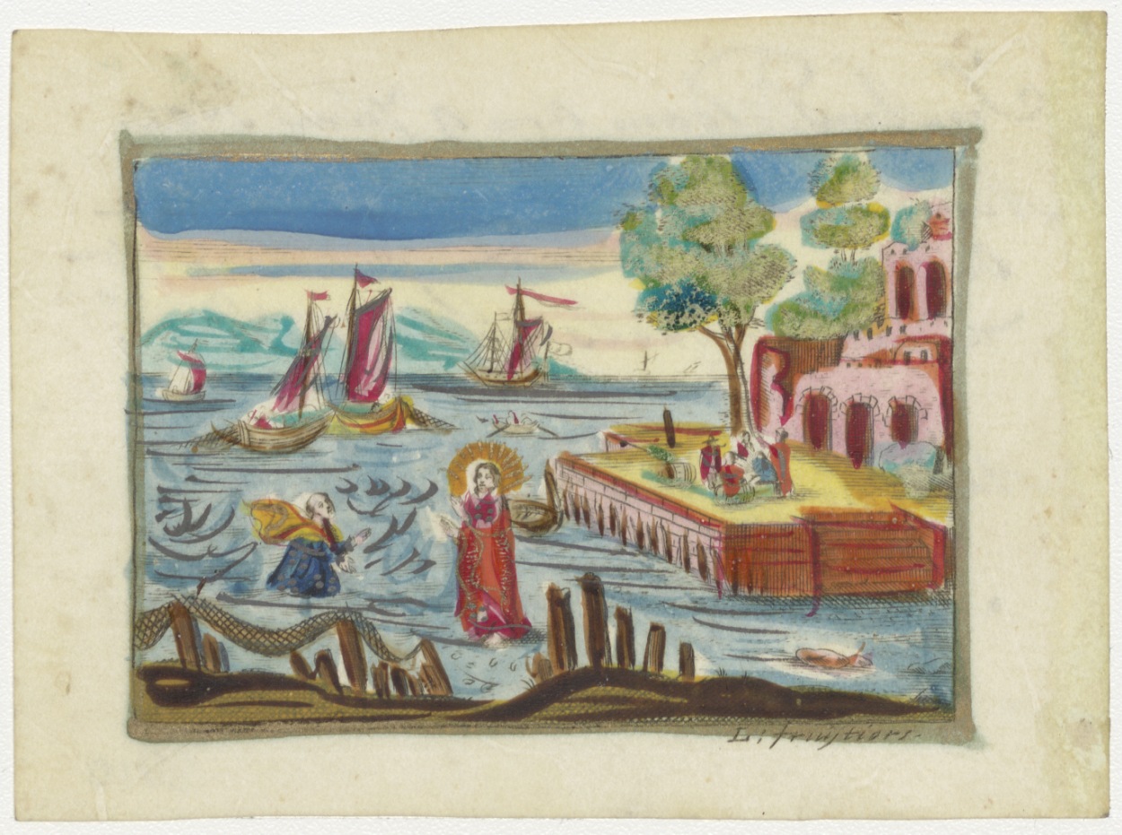 Petrus die over het water loopt en door Christus wordt gered, ingekleurd, kz. H. Vormsel Anna Maria Magdalena Schouten(1792) door graaf Cecar Brancadoro, bisschop van Nisibi, Krijtberg Amsterdam