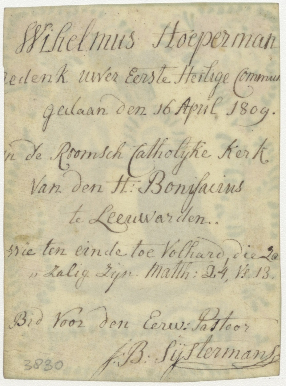 H. Stanislaus Kostka, ingekleurd, kz. H. Communie Wilhelmus Hoeperman;1809;Leeuwarden door pastoor Sijstermans