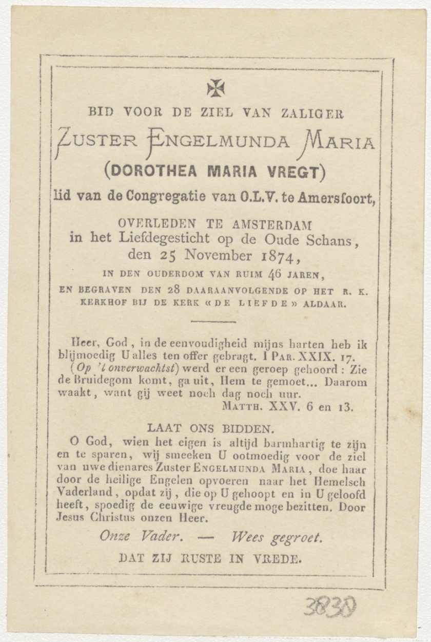 Maria, kz. religieus;Bid voor ziel zuster Engelmunda Maria (Dorothea Maria Vregt) (+1874) congregatie O.L.V. Amersfoort