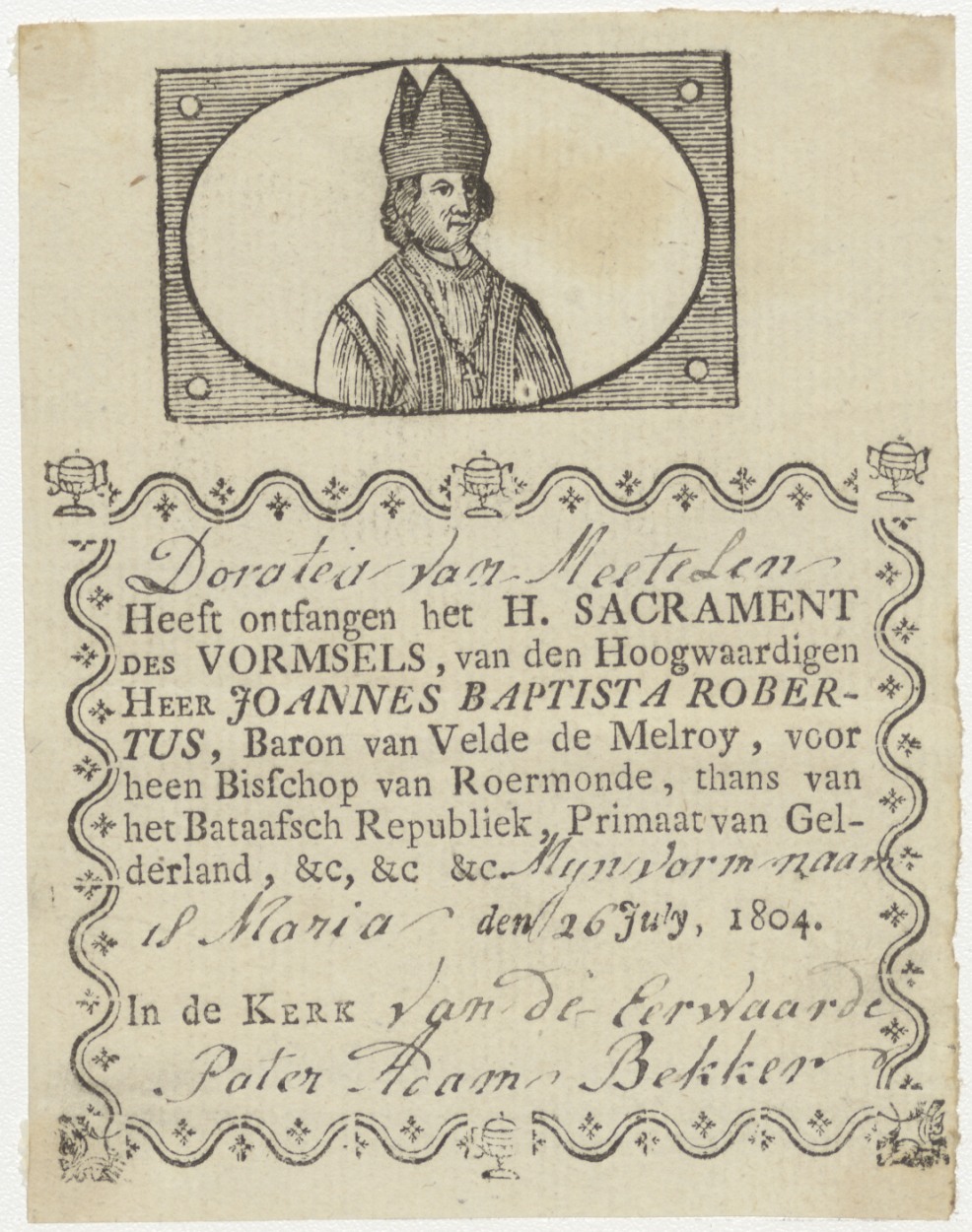 Zie versozijde, kz. H. Vormsel Dorotea van Meetelen (1804) door Joannes baron van Velde de Melroy van pastoor Bekker