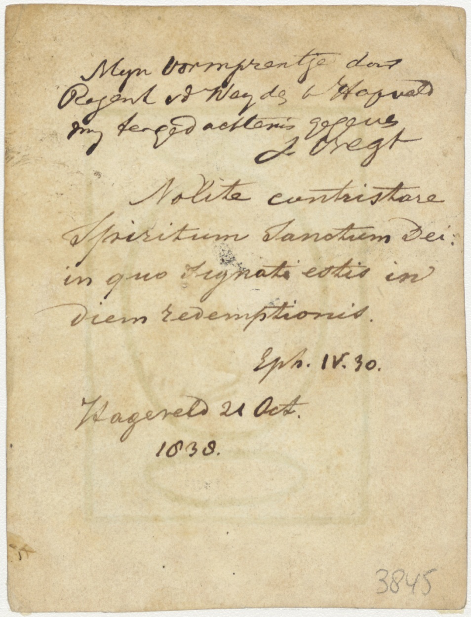 H. Geest met tien geboden en bijbel, kz. H. Vormsel J. Vregt(1838) te Hageveld