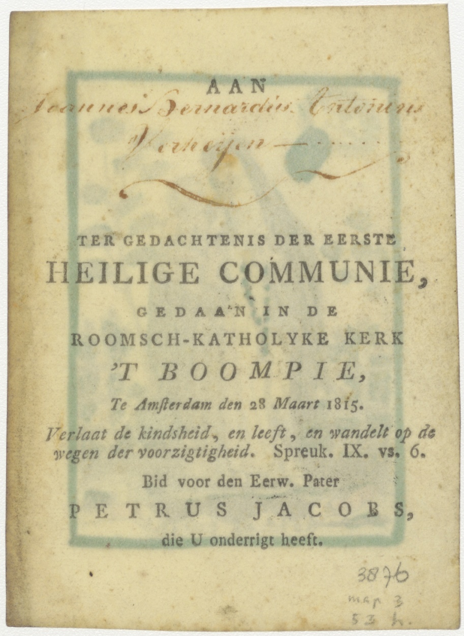 H. Rosa van de H. Maria/van Lima, ingekleurd, kz. H. Communie Verheyen; 1815; 't Boompje door pastoor Petrus Jacobs