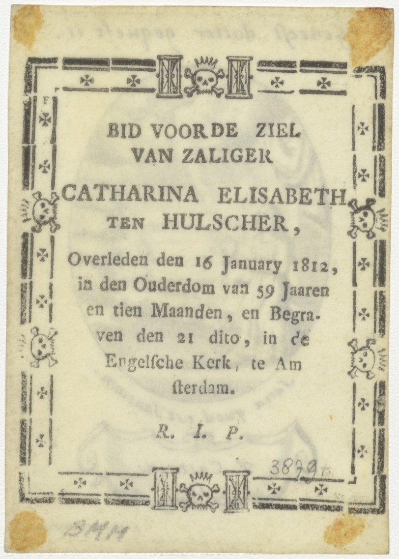 Kuisheid (F. Castitatis), kz. Bid voor ziel Catharina ten Hulscher (+1812) Amsterdam (Engelse Kerk)
