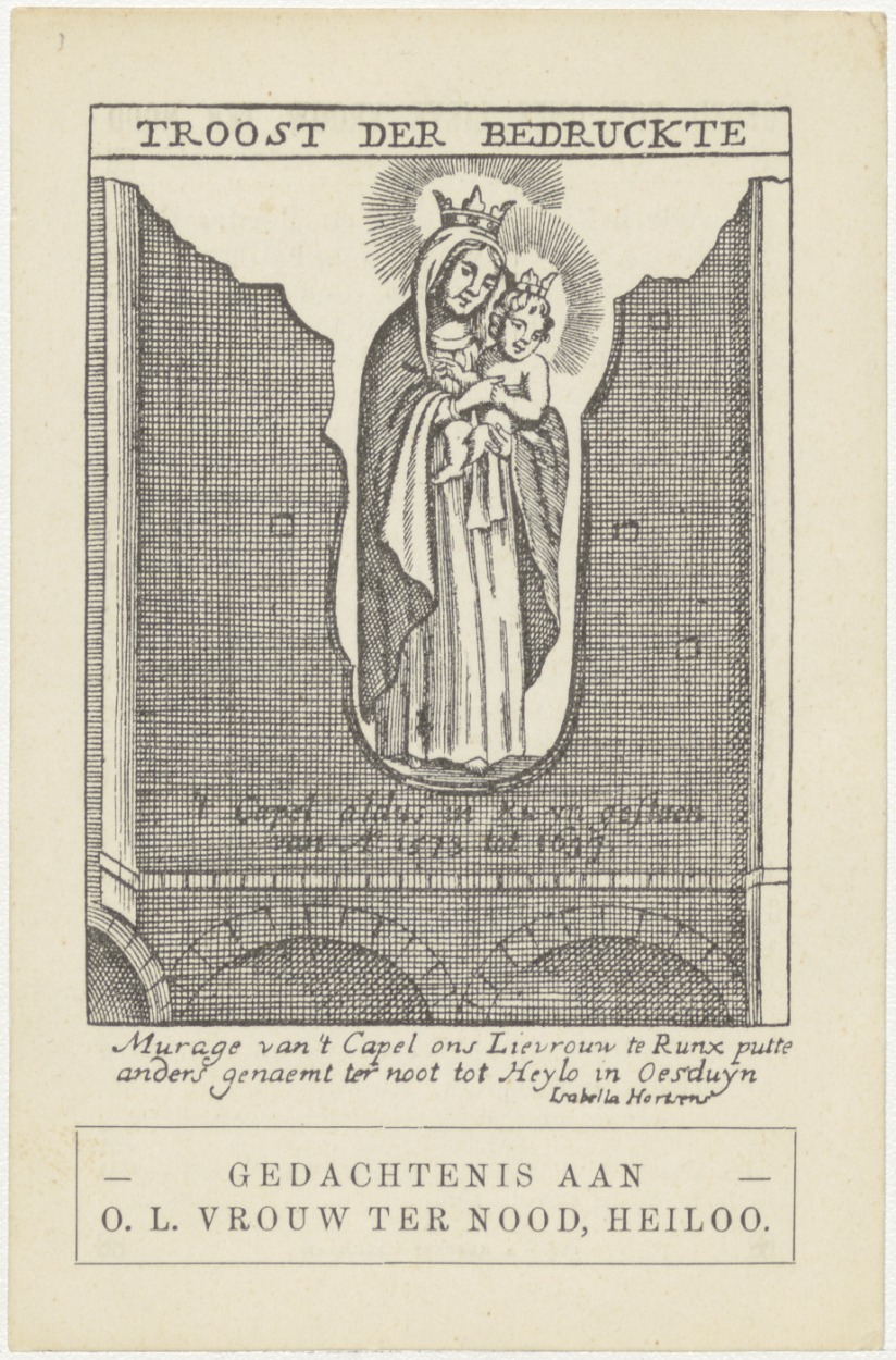 Onze Lieve Vrouw ter Nood, Heiloo, beeld in ruïne, reproduktie naar Isabella Hertsens, kz. Gebed voor de bekering van ons vaderland