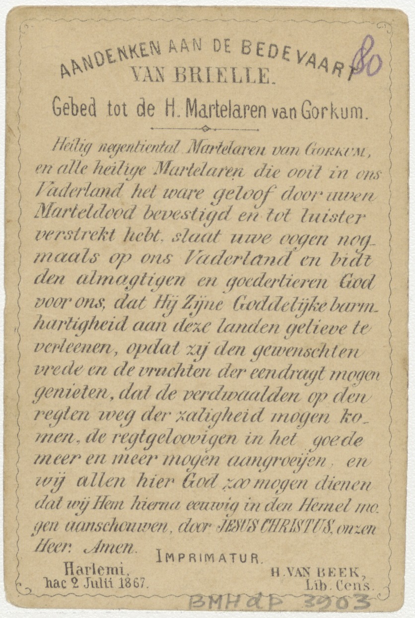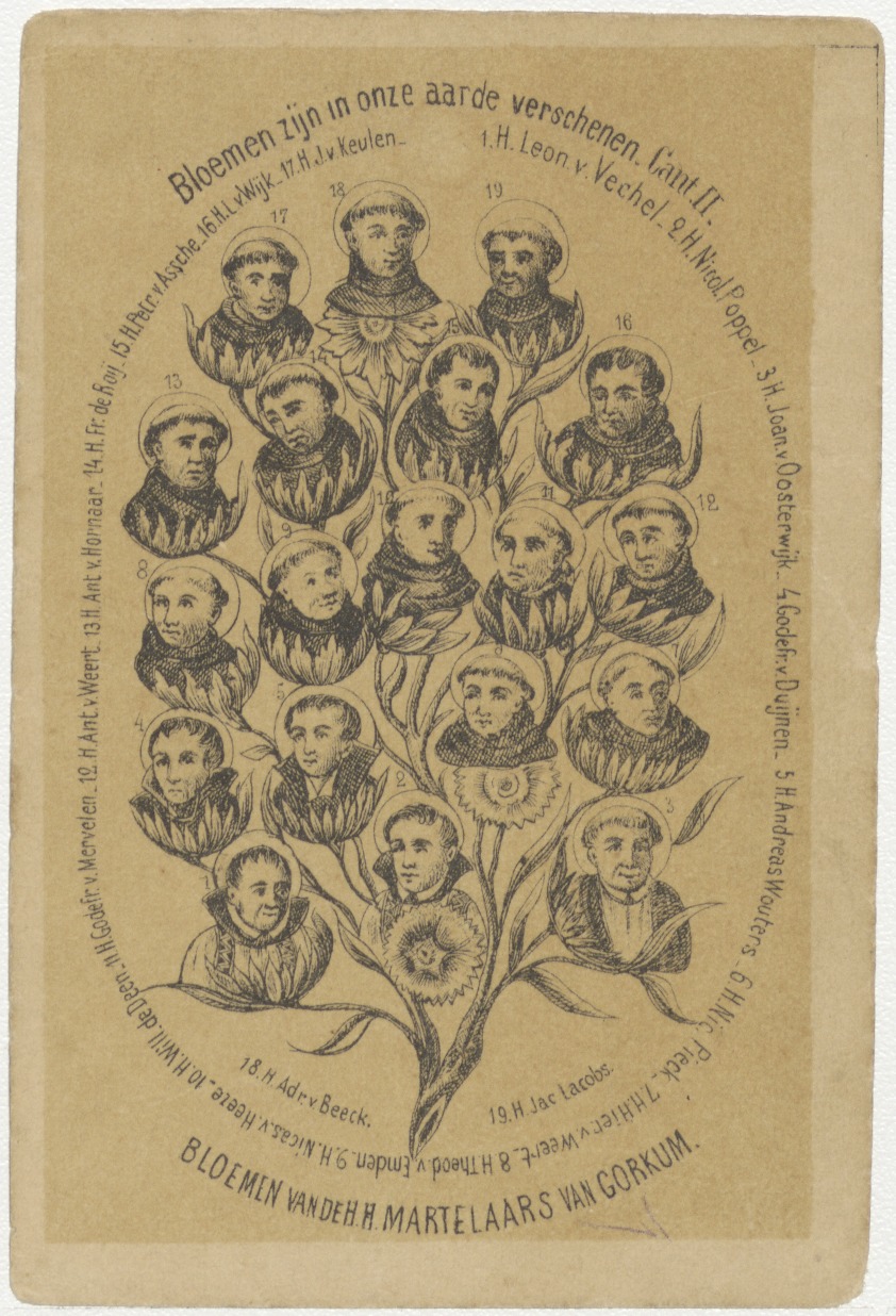 Bloemen van de HH. Martelaren van Gorcum, negentien portretten in een struik, kz. Aandenken aan de bedevaart van Brielle, gebed