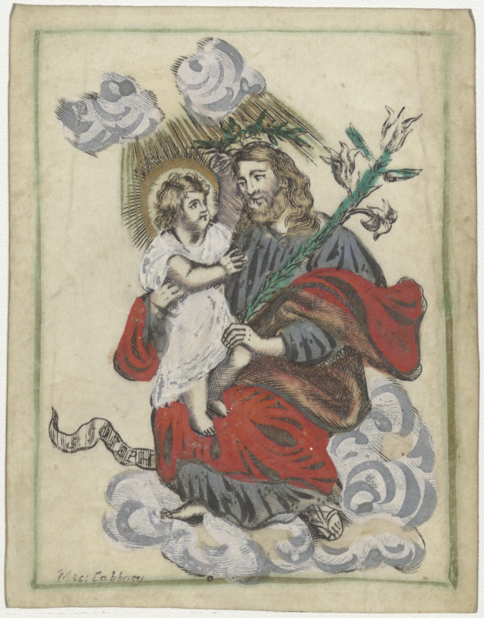 H. Joseph (Jozef) zittend op wolk met Christuskind, ingekleurd
