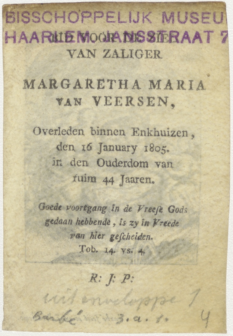 Geboorte van Christus, kz. Bid voor ziel Margaretha Maria van Veersen (+1805) Enkhuizen