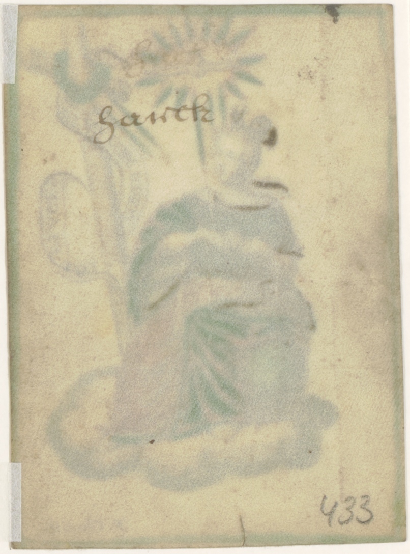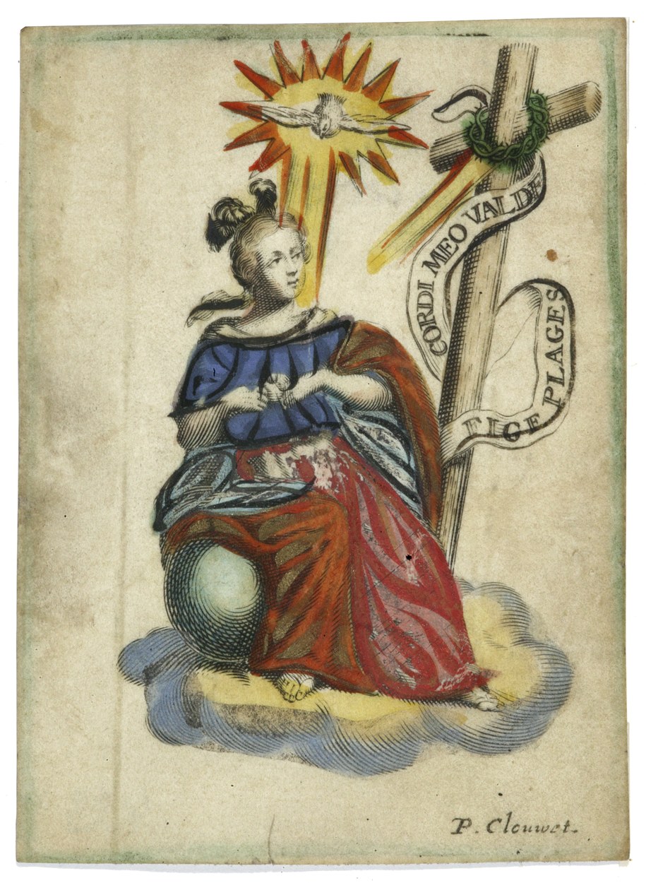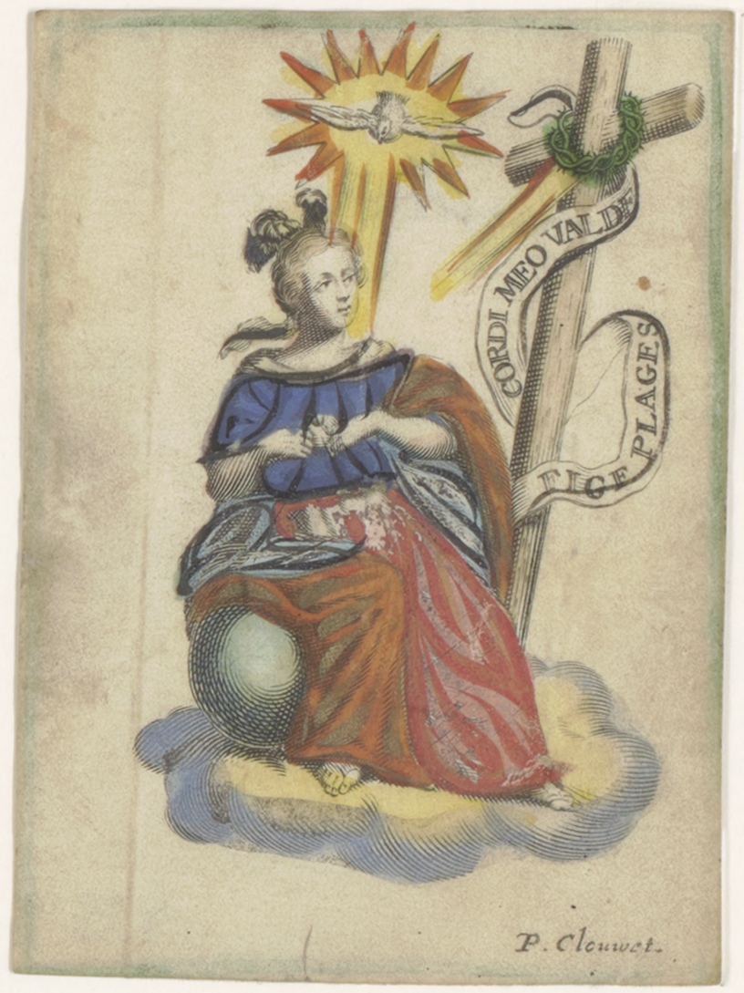Allegorie van Het Geloof met kruis met bandelrol met "Cordi meo valde ..." en H. Geest, ingekleurd