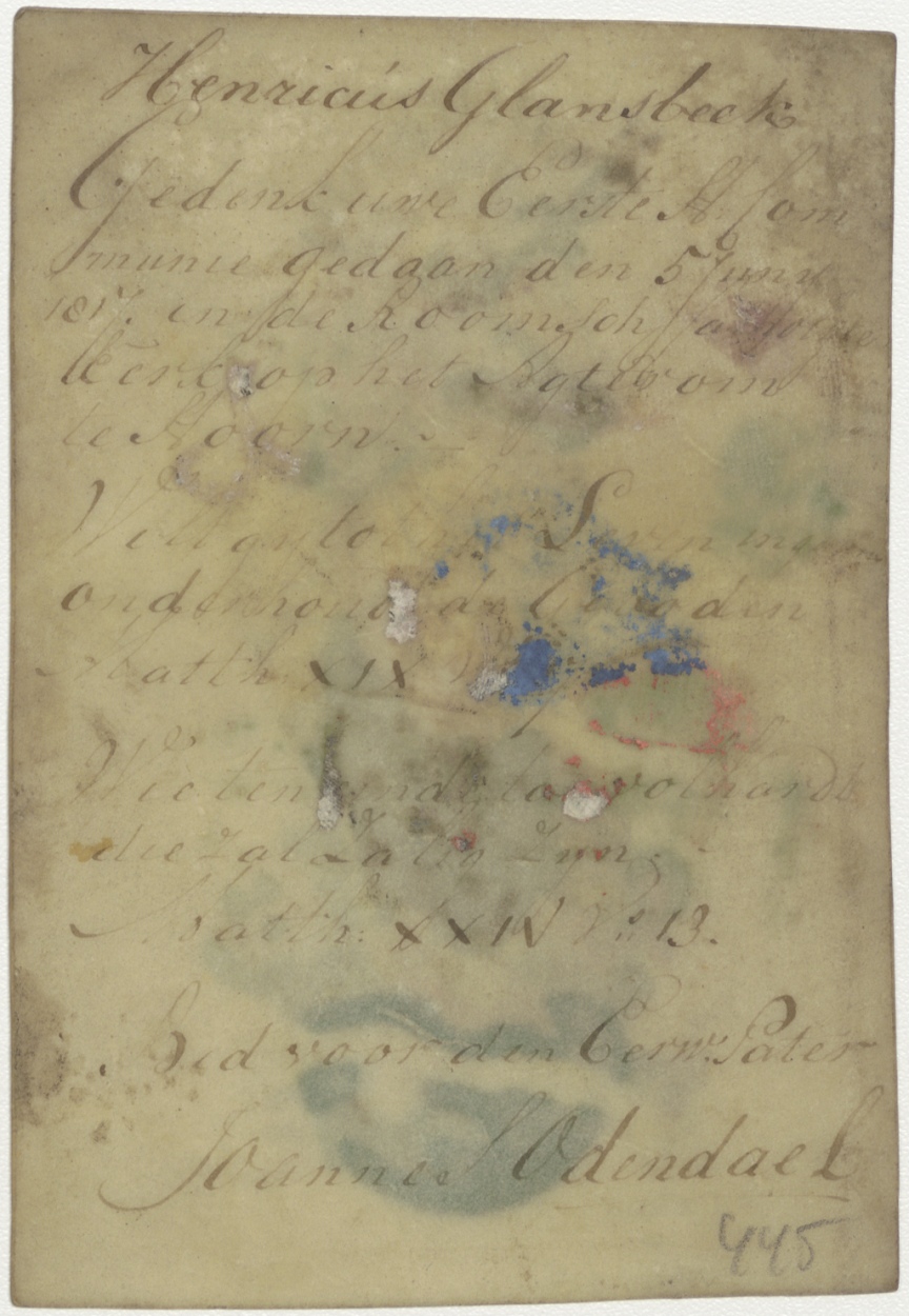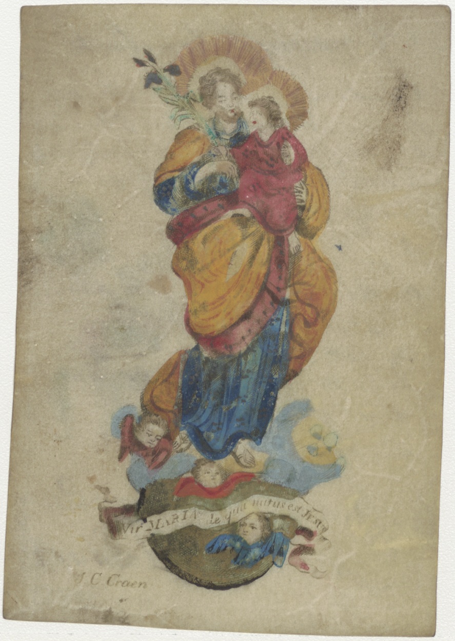 Maria met Christuskind op maansikkel, ingekleurd, kz. H. Communie Glansbeek;1817;Hoorn door pastoor Joannes Odendael