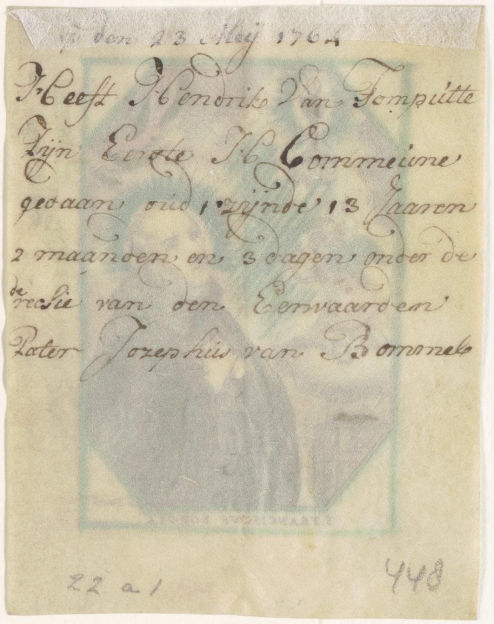H. Franciscus Borgia, ingekleurd, kz. H. Communie van Tomputte;1764;door pastoor Jozephus van Bommel