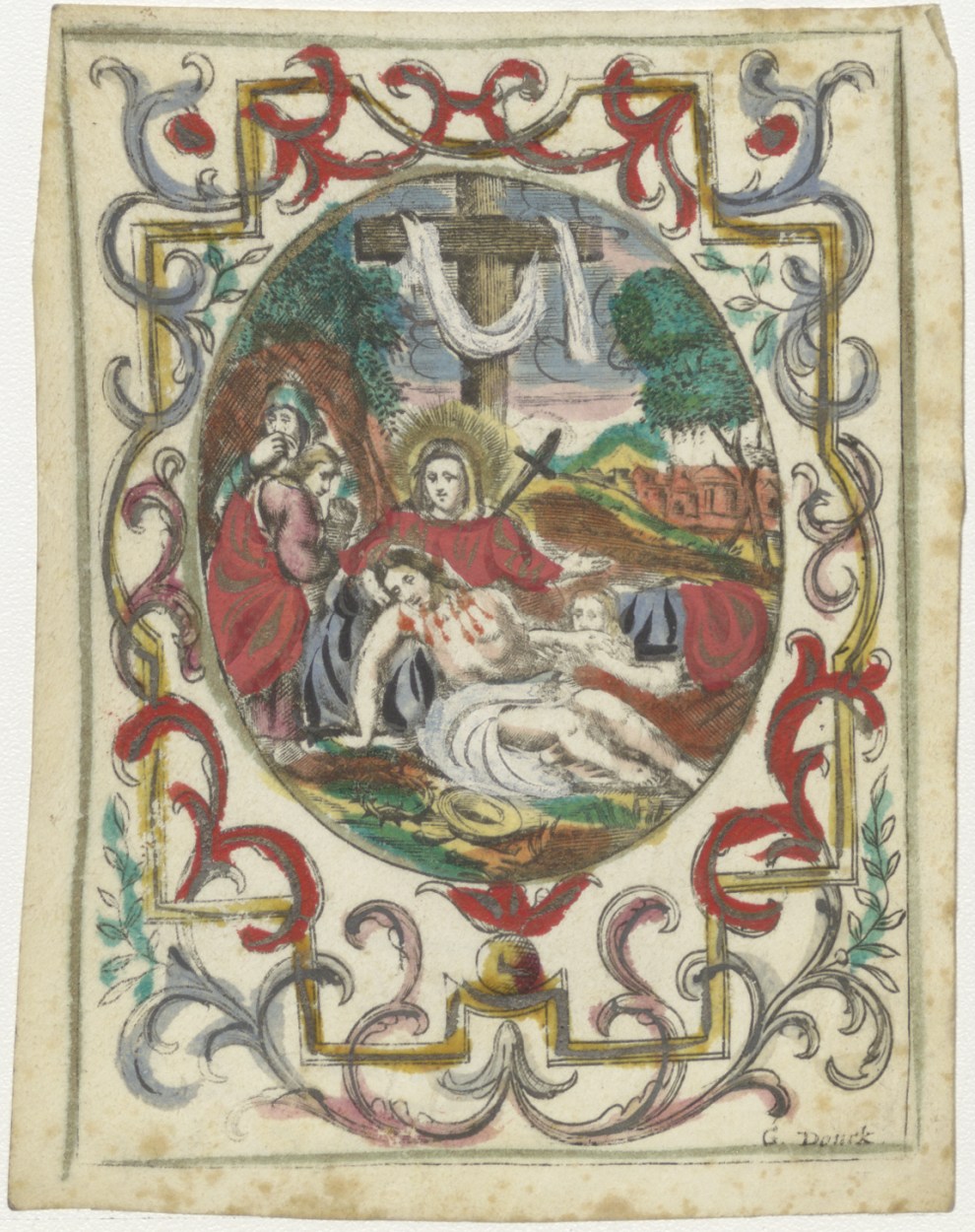 Kruisafneming, Maria met lichaam van Christus, piëta, Johannes en Maria Magdalena, ingekleurd