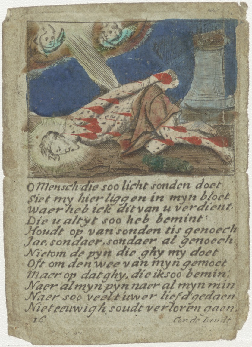 Gemartelde Christus op de grond liggend, met gebed, ingekleurd