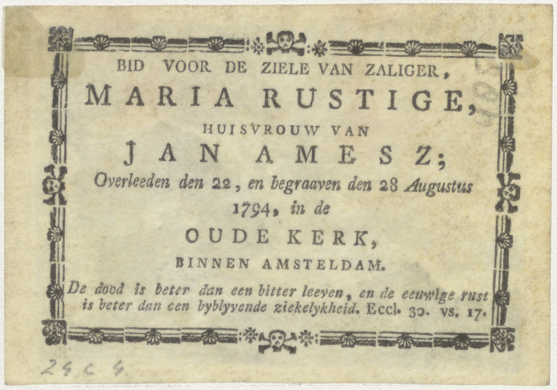 Man(?) biddend in een grot, kz. Bid voor ziel Amesz-Rustige (+1794);Oude Kerk Amsterdam;
