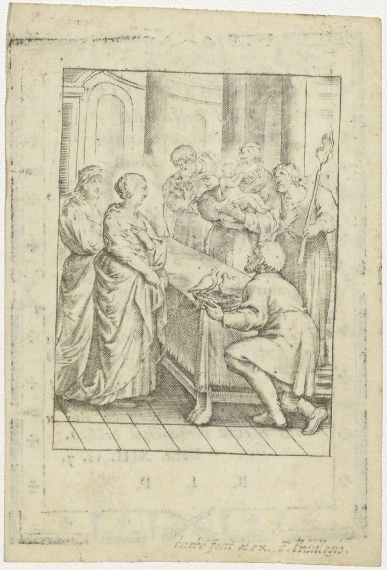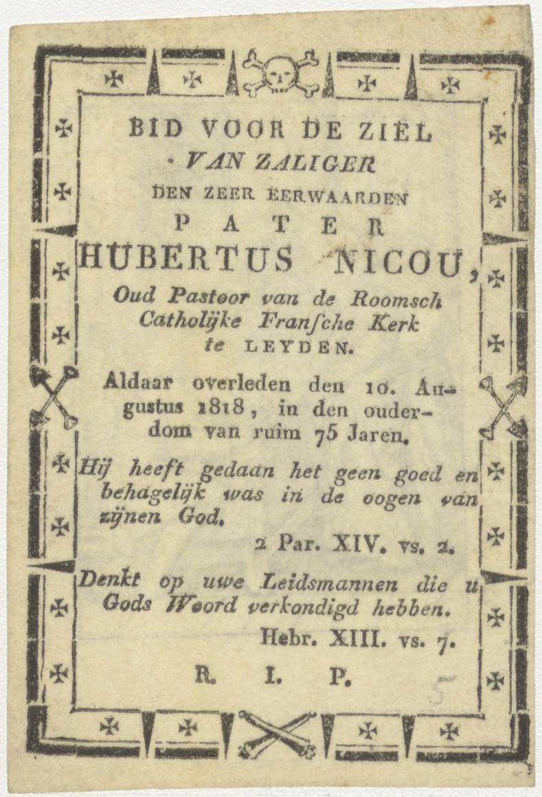 Doop van Christus in de tempel, Maria, Joachim, Anna(?), kz. Religieus;Bid voor ziel Hubertus Nicou (+ 1818);R.K. Fransche kerk te Leiden;