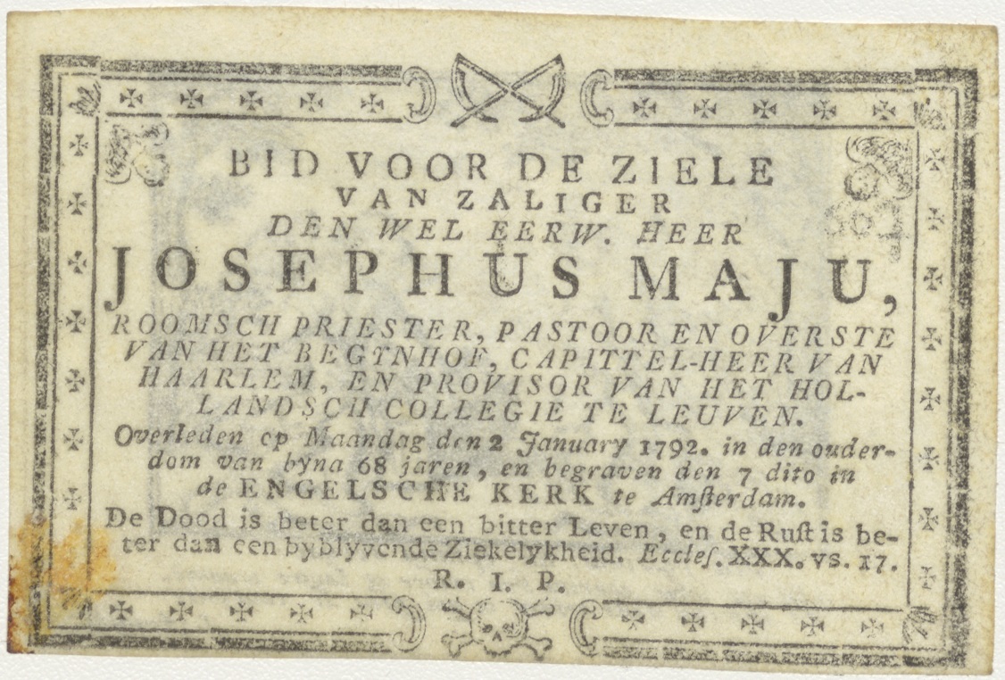 Twee engeltjes, Christuskind spelend, kz. Religieus;Bid voor ziel Josephus Maju (+1792) pastoor Begijnhof capittel-heer van Haarlem