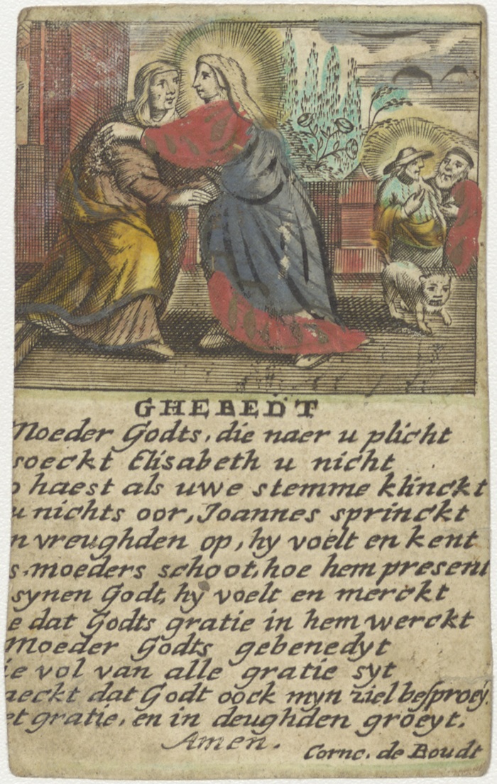 Visitatie, ontmoeting Maria en Elisabeth met gebed, ingekleurd
