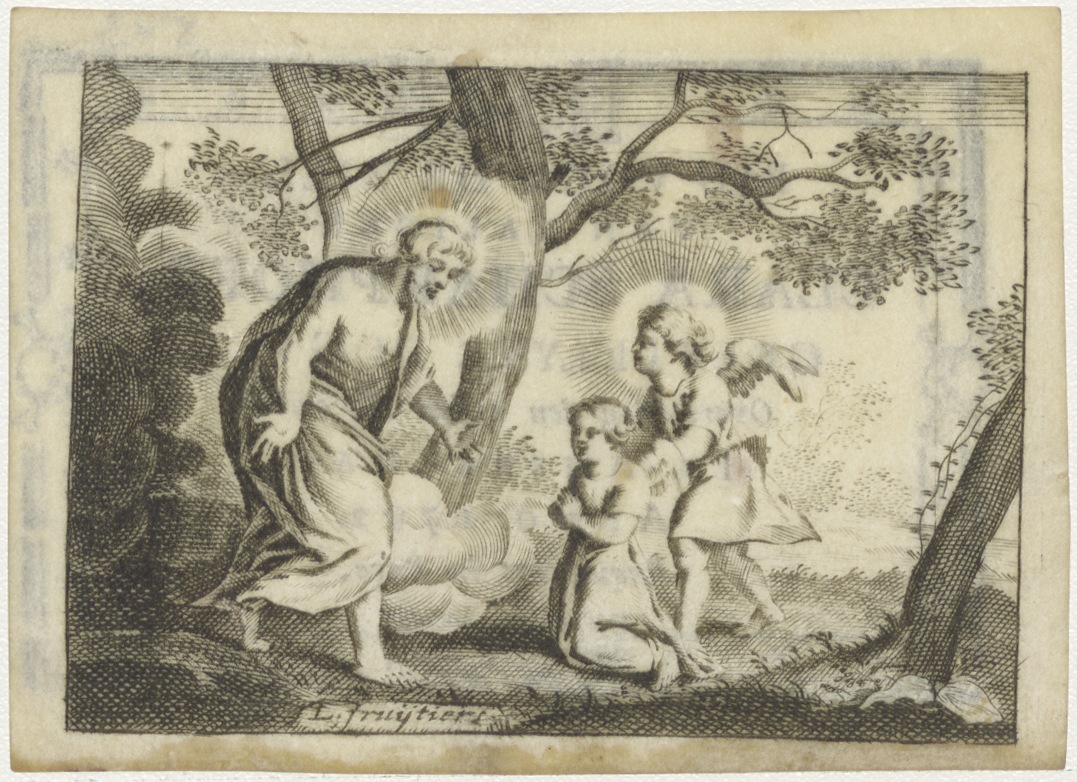 Christus(?) met twee engelen, kz. Religieus;Bid voor ziel Scharphoff (+1792) geestelijk dogter Amsterdam