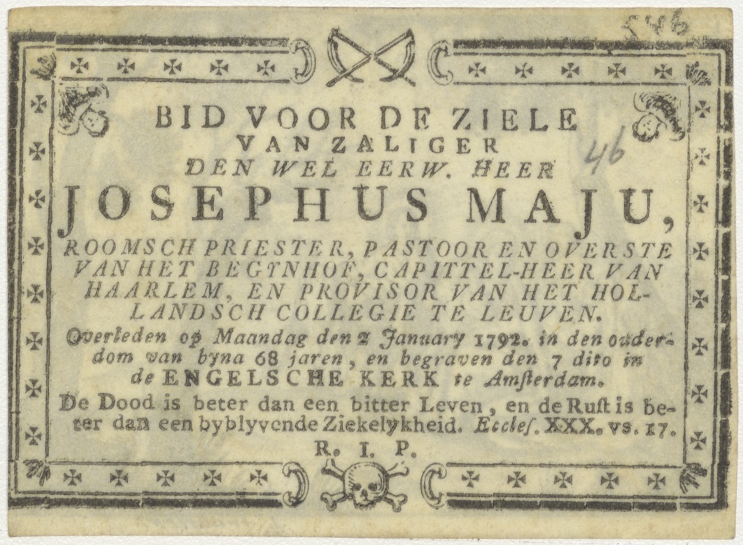 Rust op de vlucht naar Egypte, kz. Religieus;Bid voor ziel Josepus Maju (+1792);pastoor Begijnhof, capittelheer Haarlem etc.
