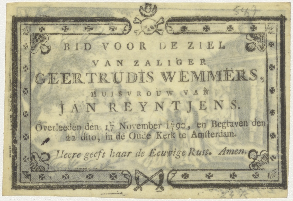 Visitatie, ontmoeting Maria en Elisabeth, kz. Bid voor ziel Reyntjes-Wemmers (+1790);Oude Kerk Amsterdam