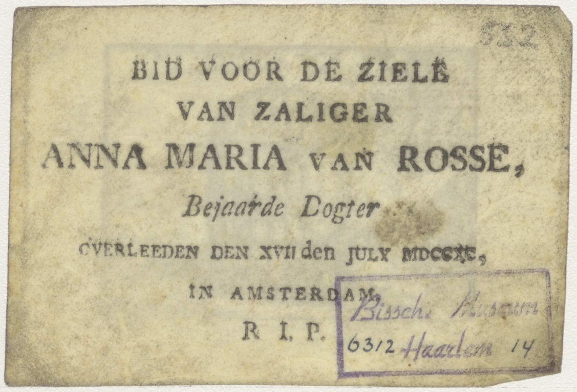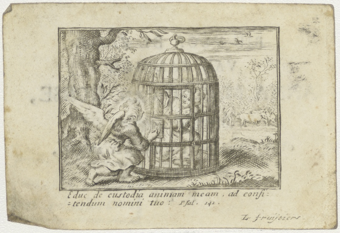 Engeltje dat kind in een kooi bevrijdt, kz. Religieus;Bid voor ziel Anna Maria van Rosse (+1740), bejaarde dogter Amsterdam