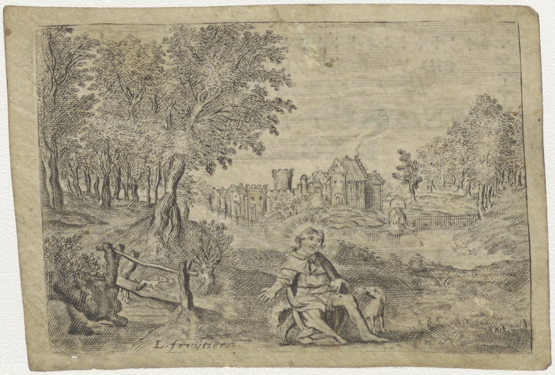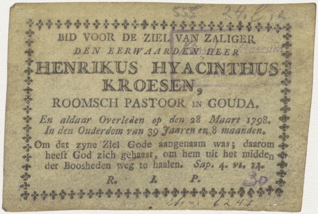 Christus(?) in landschap, kz. Religieus;Bid voor ziel Kroesen (+1798) pastoor te Gouda