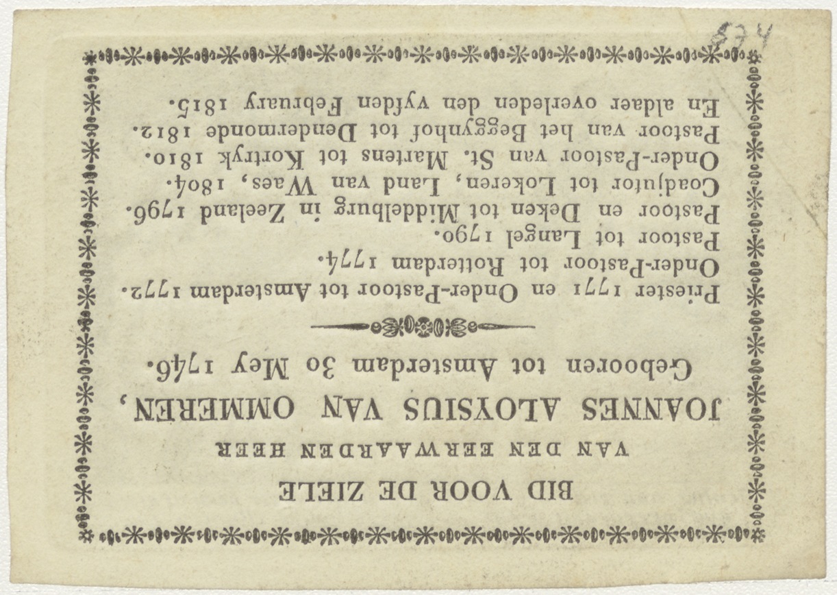 Wie roemt roeme de Heere: God en mensen (1 Kor.2), kz. Religieus;Bid voor ziel Joannes van Ommeren (+1815);pastoor Begijnhof tot Dendermonde