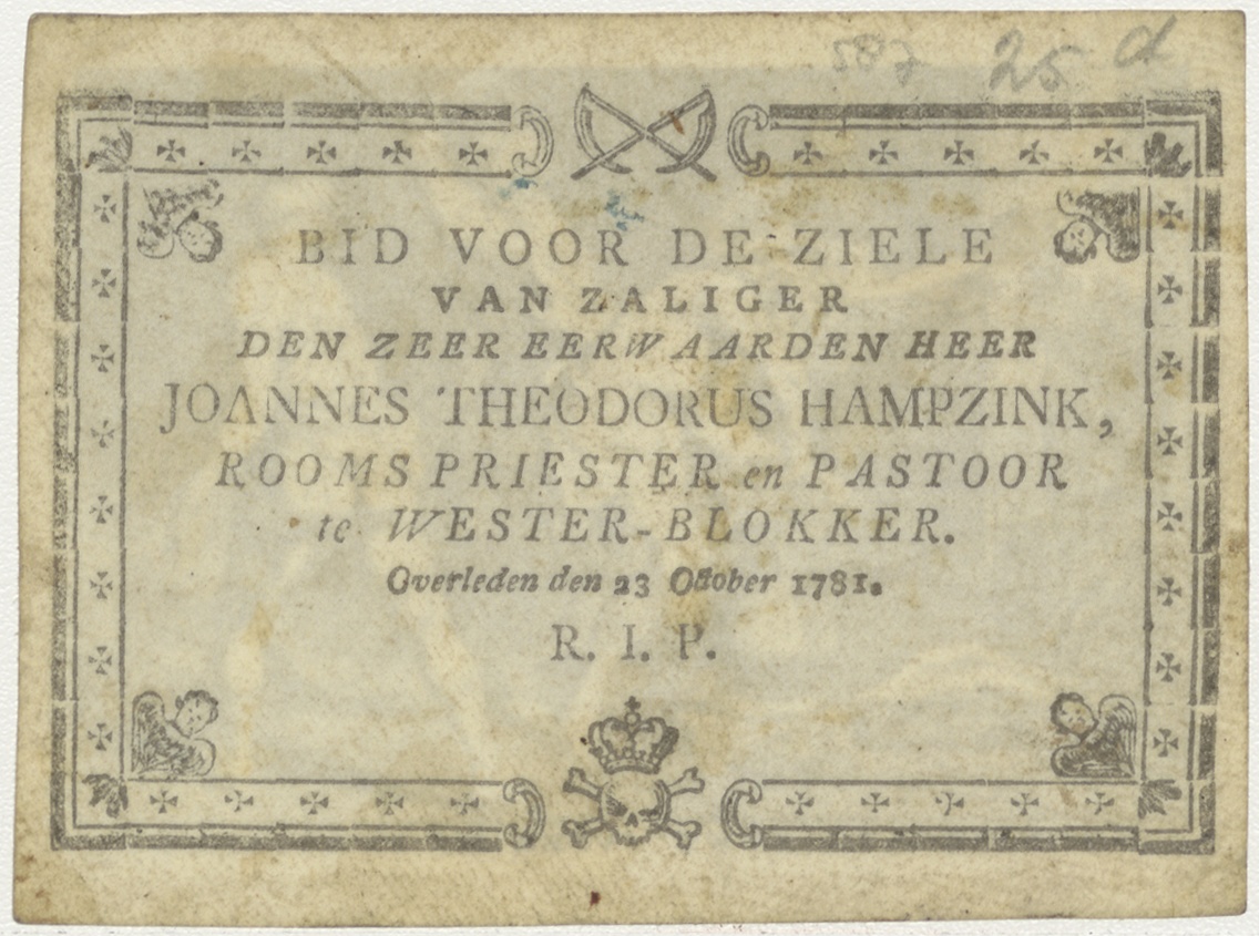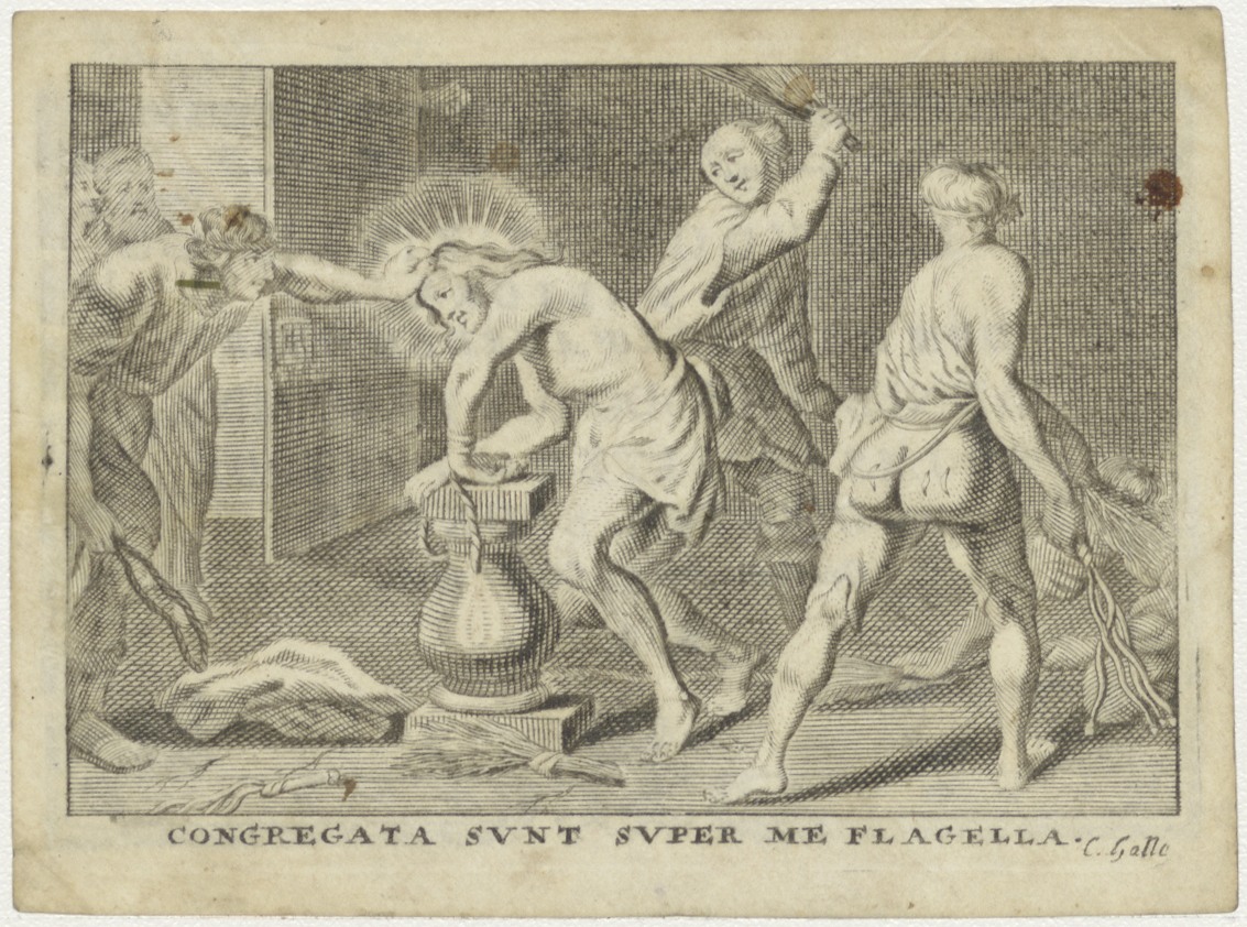 Passiescène, marteling van Christus, kz. Religieus;Bid voor ziel Joannes Hampzink (+1781);priester te Wester-Blokker