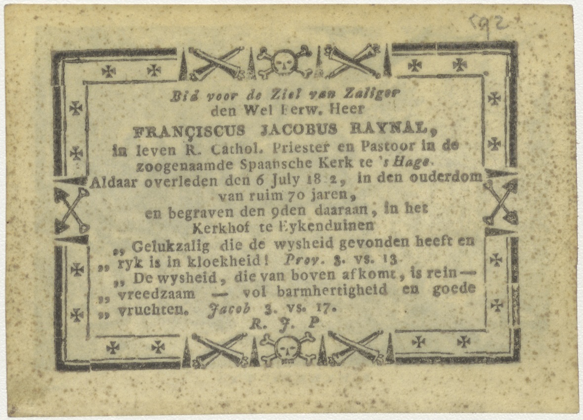 H. Benedictus, kz. Religieus;Bid voor ziel Franciscus Raynal (+1822);Spaanse kerk Den Haag;