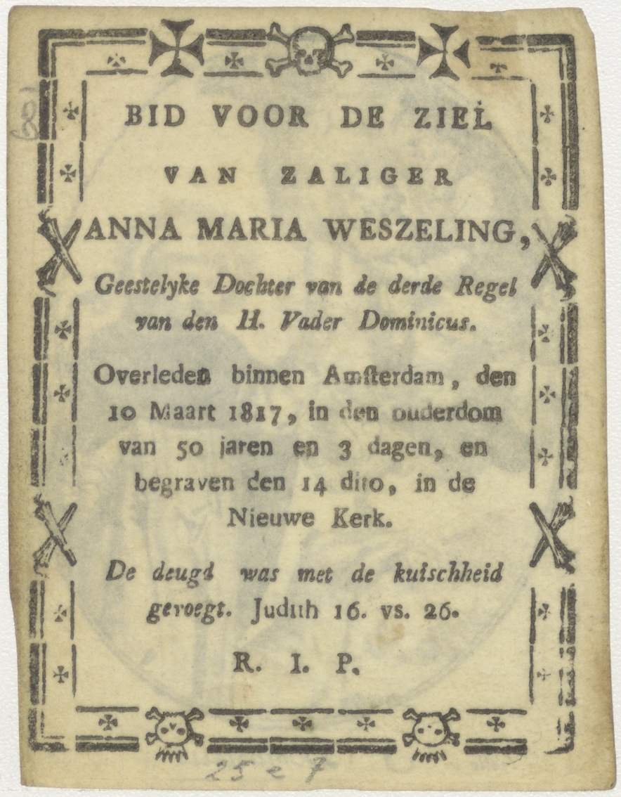 H. Dominicus, kz. Religieus;Bid voor ziel Anna Weszeling (+1817), geestelijk dochter H. Dominicus Amsterdam