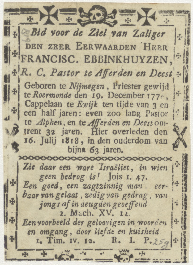 H. Blasius, kz. Religieus;Bid voor ziel Franciscus Ebbinkhuyzen (+1818);pastoor te Afterden en Deest
